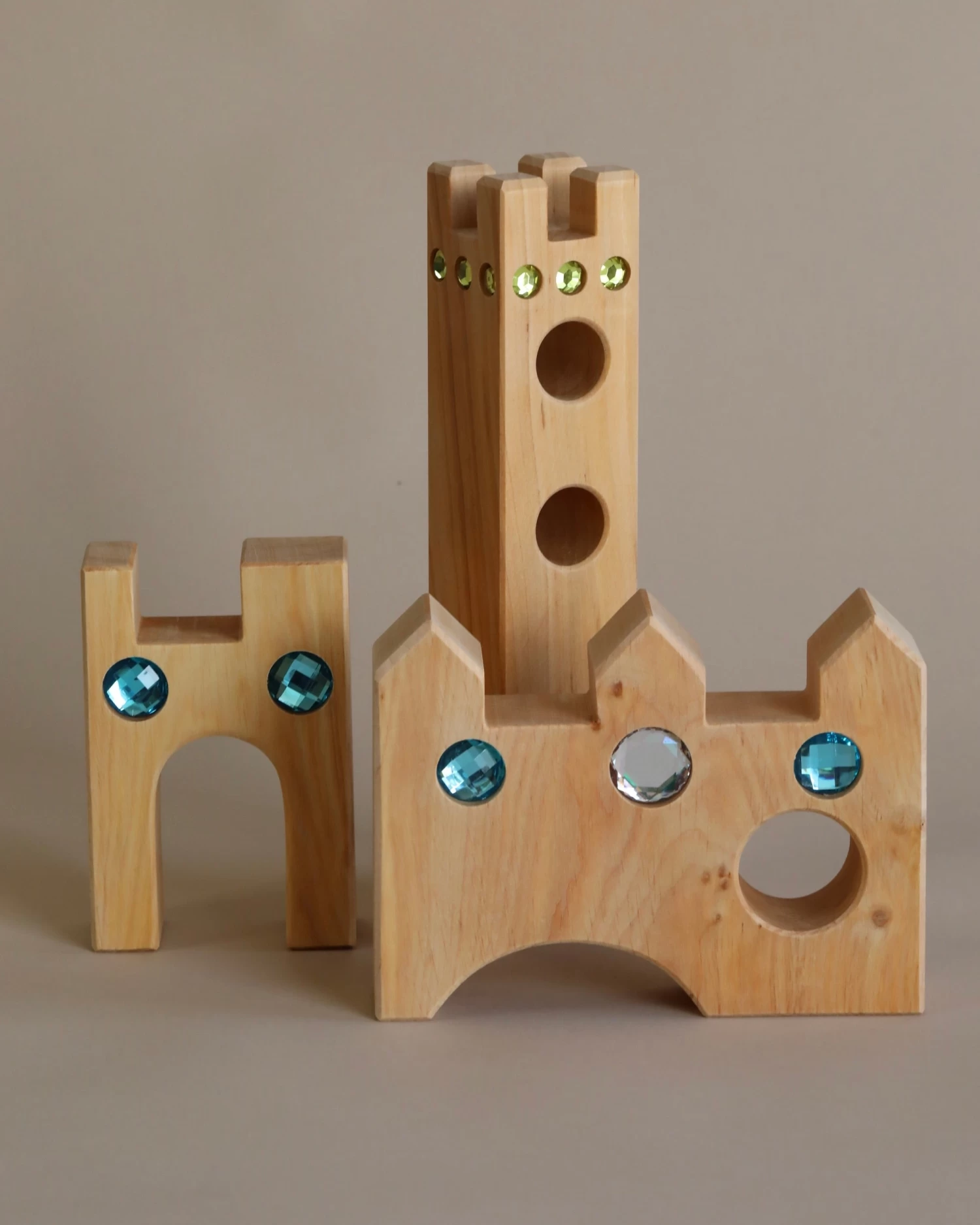The Fairytale Castle set features a collection of sturdy wooden blocks, arches, and towers that can be assembled in endless combinations. With its vibrant colors and intricate detailing, this castle captures the essence of a whimsical fairytale setting, ready to be brought to life by your child’s imagination.