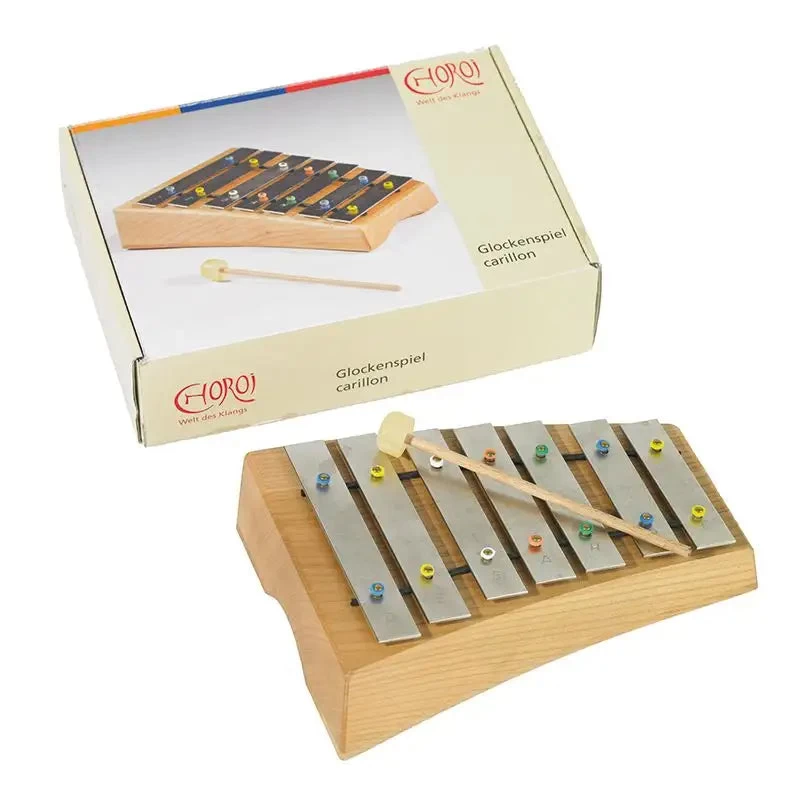 These three-tone glockenspiels use the same tones as are on our Pentatonic Glockenspiel. A simple instrument that fits nicely when playing in groups or for a toddler to begin with. Maple wood, brass plates.