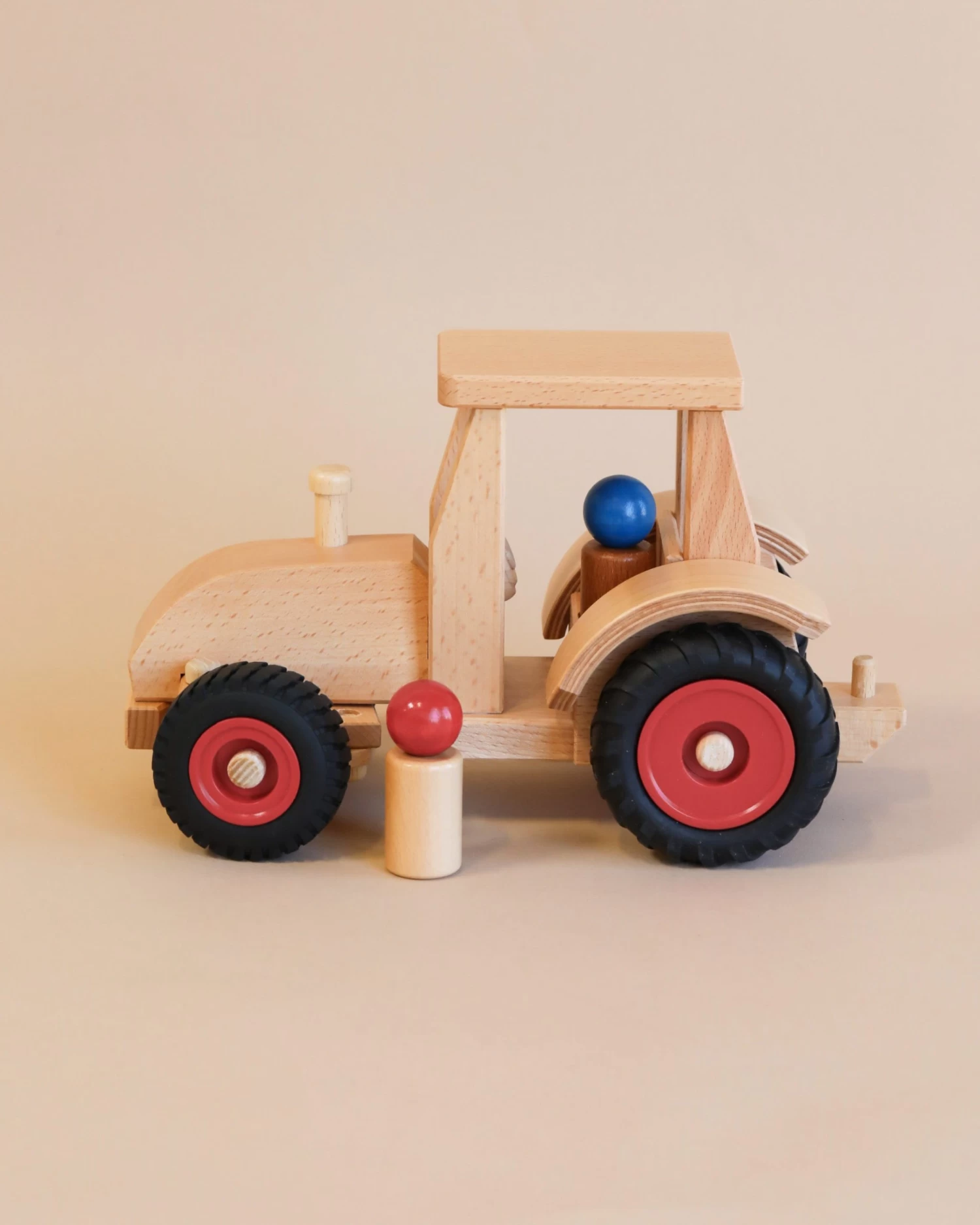 A new wooden tractor with a modern look. Young hands can grasp the roof of the cab, and by pushing in the intended direction steer the wheels. Inside is a pair of peg figures, which can be removed for imaginative play. The sturdy structure and real rubber tires make it resistant to wear and tear from driving and construction activities. The wooden toys are handcrafted in a workshop for the disabled using beechwood, with interlocking, doweled, and glued connections. No nails, screws, or staples are used.