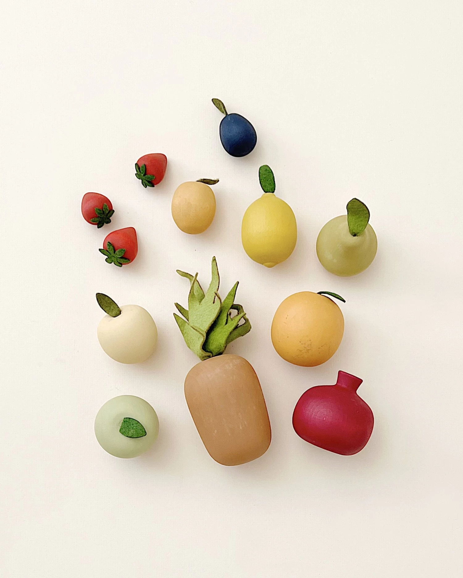 The set includes 10 kinds of fruit: pineapple, pomegranat, pear, apple, peach, apricot, plum, orange, lemon and 3 strawberries.