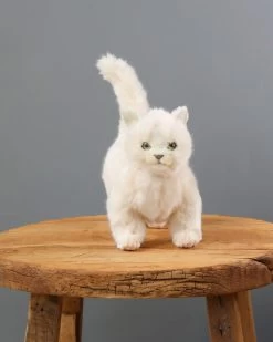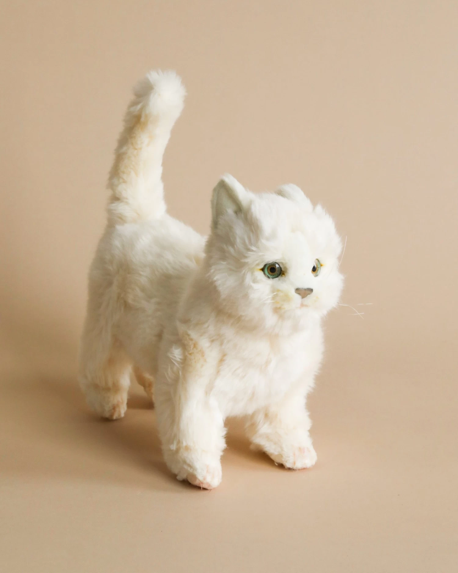 Artisan hand sew the animals “inside out”, an old world tradition that results in the mininization of seams, and their bodies are carefully “sculpted” to create “musculature” and “features” like movement in a walking or sitting position that are unique to each creature. On average, there are 42 separate pieces required to make each animal, that must be combined by a team of truly creative artists to create the distinctly realistic features that characterize HANSA animals. (Some animals have as many as 240 different parts!) Each animal is individually hand sewn, to give it a unique “personality”, there are more than 860 different fabrics and man-made furs from which the “coat” and “hides” are made, along with over 6000 sets of different eyes, whiskers, claws, noses, and related accessories allocated for creating these wonderful plush animals. Stuffing emphasizes careful attention to the placement of the highest quality man-made materials.