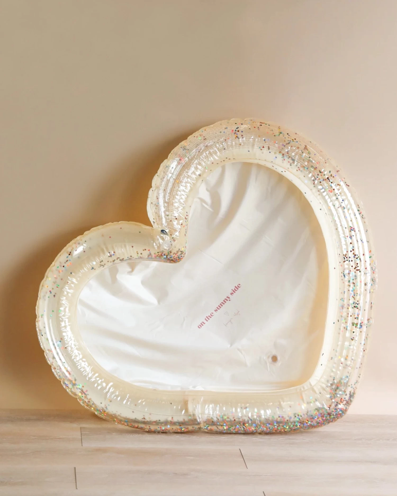Transparent inflatable heart shaped pool made from durable PVC designed with glitter and confetti inside.