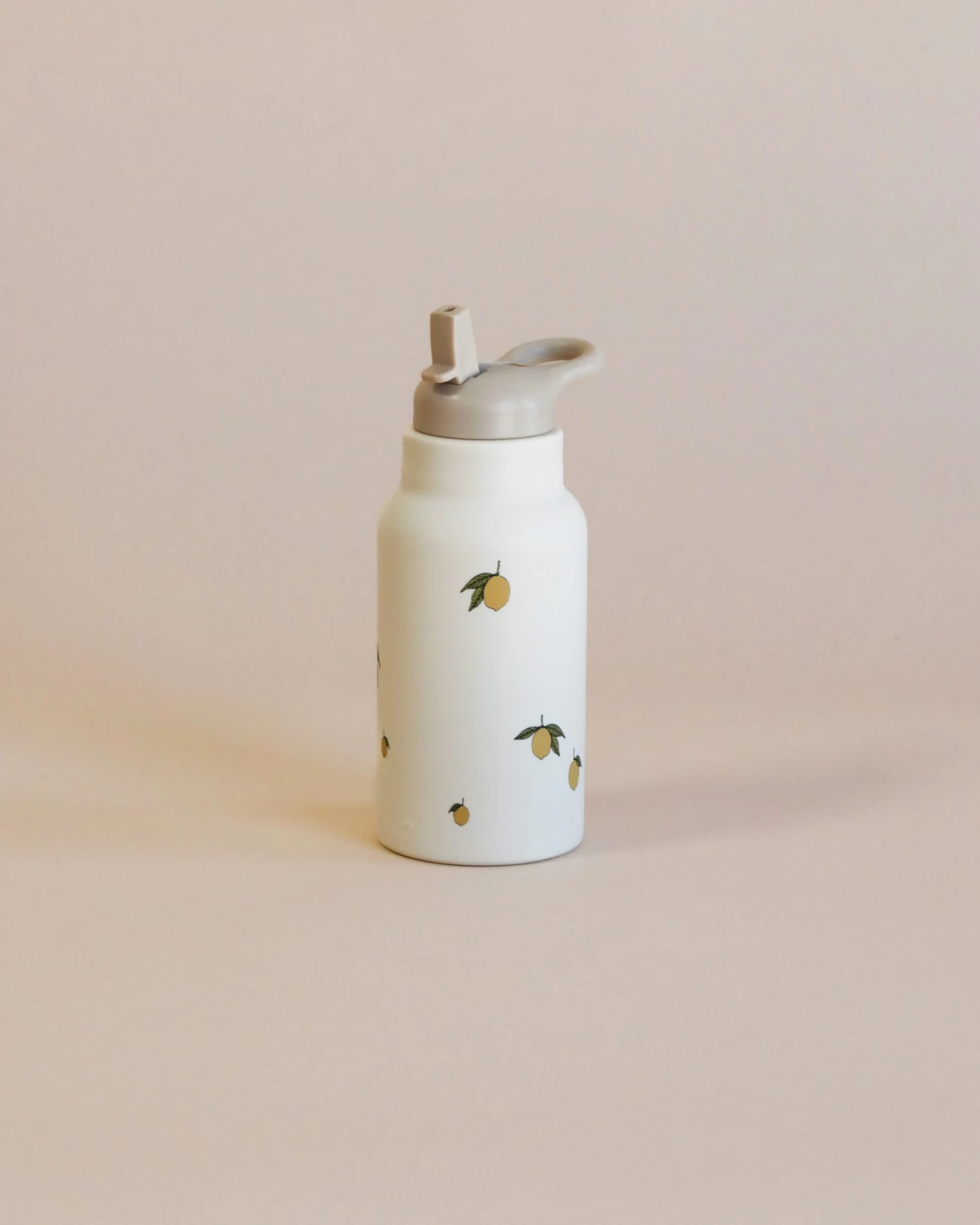 Drinking bottle made in silicone designed with a spill proof sippy cap. The cap is compatible with Konges Sløjd thermo bottles.