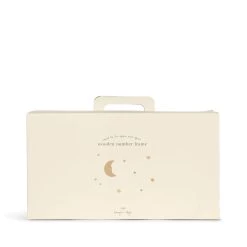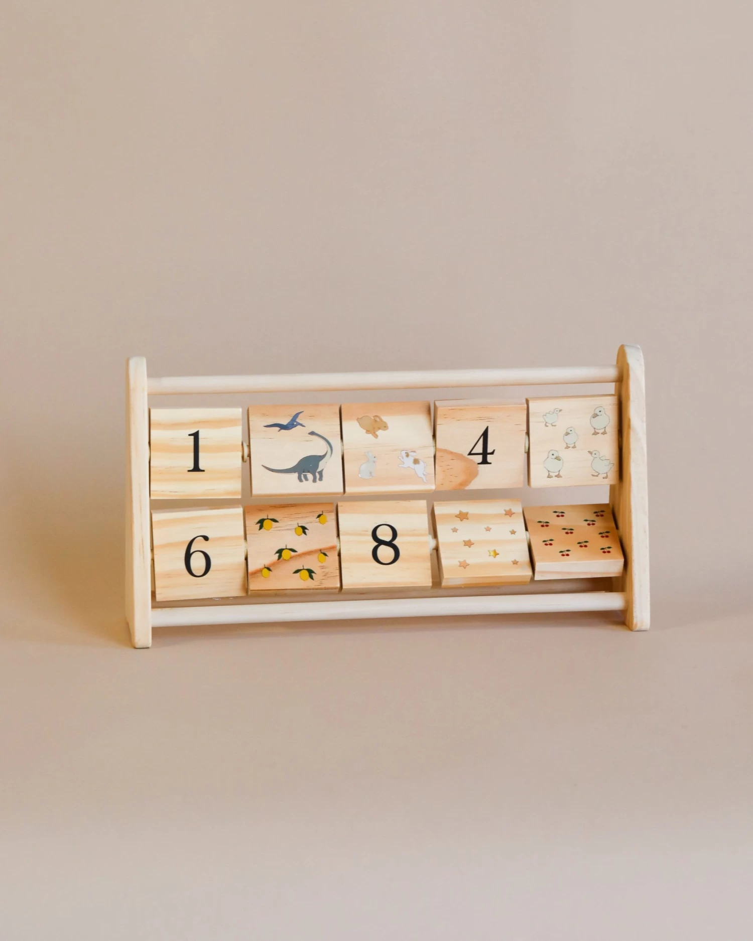 Wooden frame designed with turnable square bricks with numbers on one side and an equivalent number of illustrations on the other.