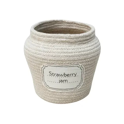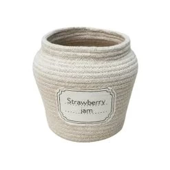 Shaped as a jar, the Jam basket is handcrafted using a braided cord made of fibers from recycled PET-bottles mixed with our cotton colors. With a base in natural color and a lid in Terracotta and natural, the basket comes with an embroidered jar label indicating “Strawberry Jam”.
