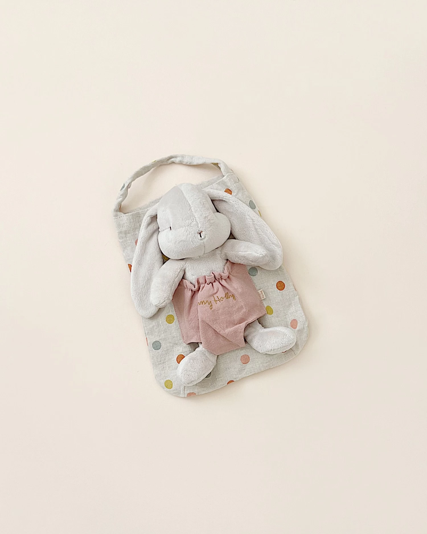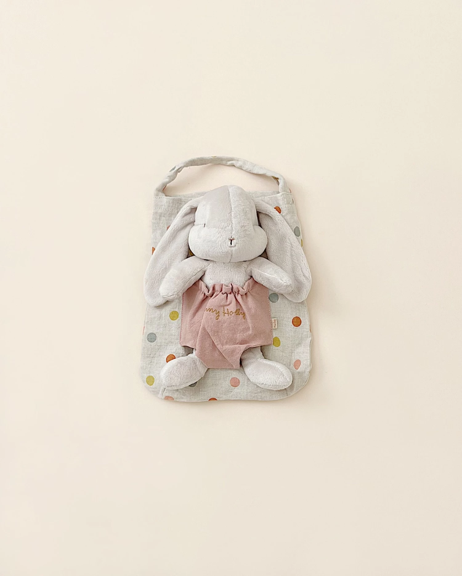 Bunny Holly is a must-have for all small cuddlers. Their plush design is so soft, and they fit perfectly in your arms. Bunny Holly comes with a sweet polka dot bag with a pocket on it, so you can carry your friend along.