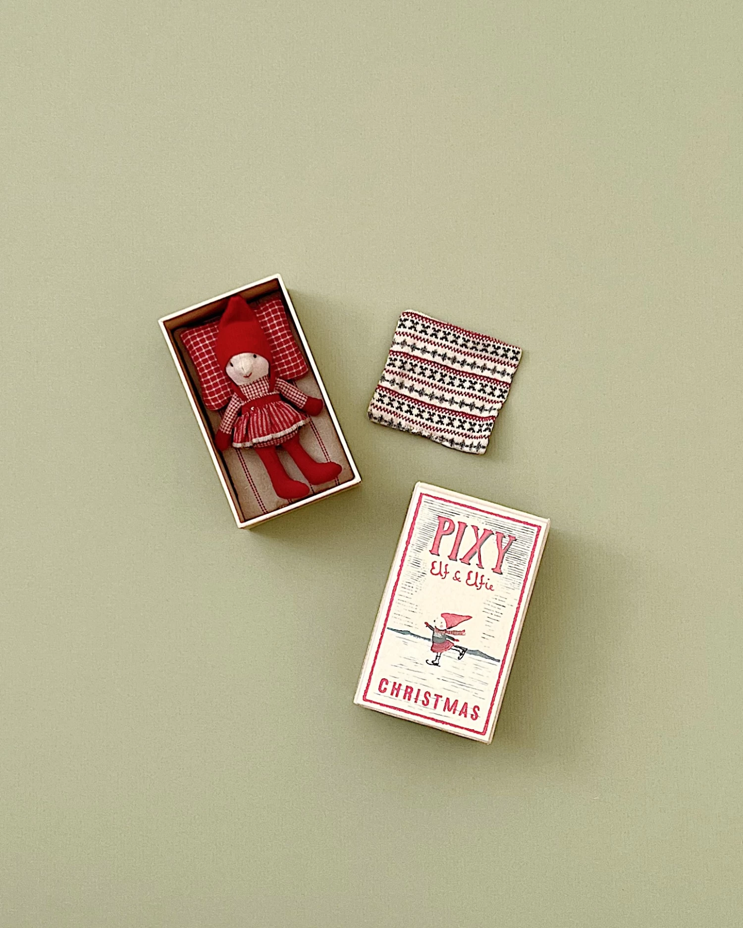 A lovely Christmas friend. Pixy Elfie comes in a beautiful matchbox with soft bedding. She fits perfectly into the Christmas story and the Maileg ginger bread house.
