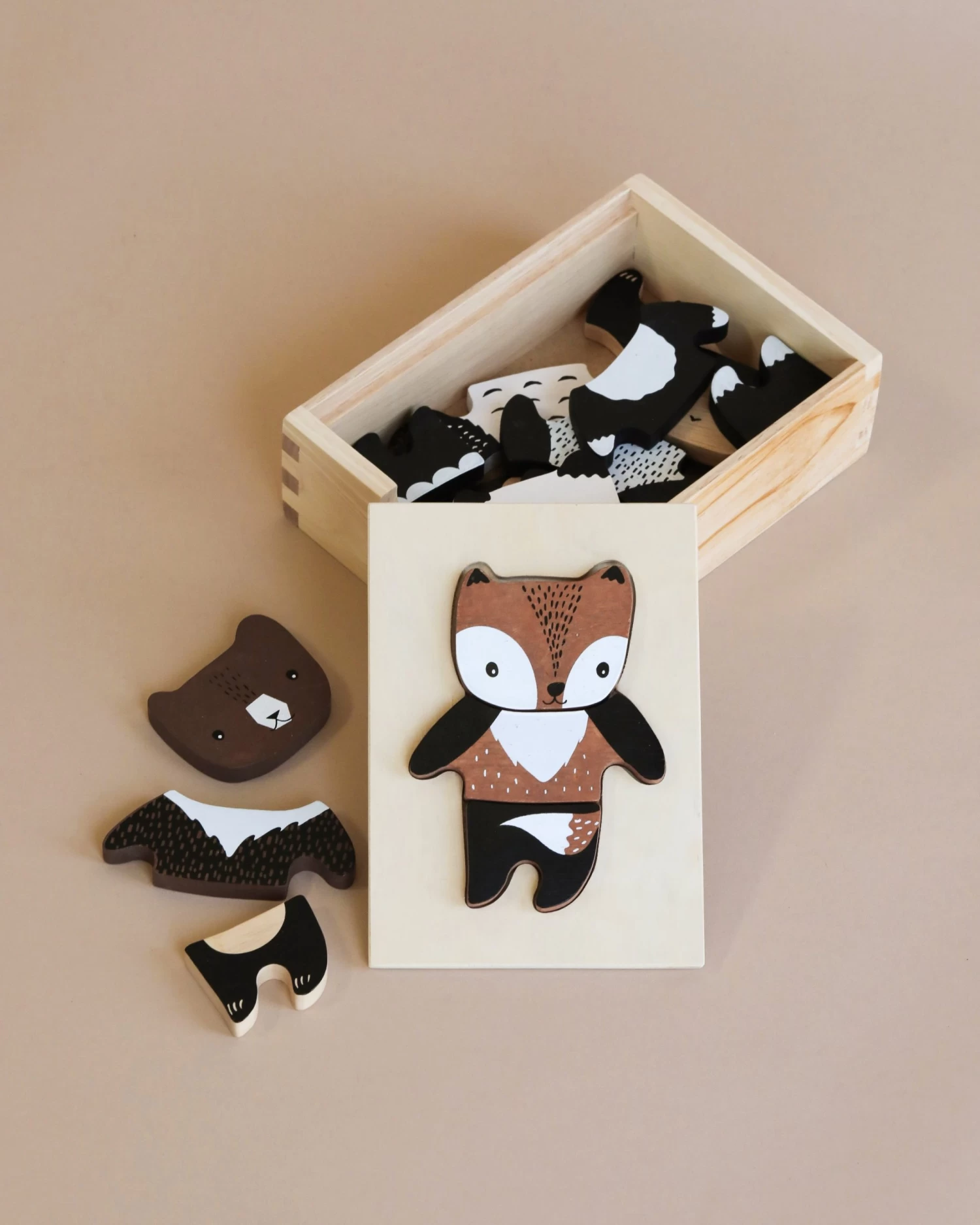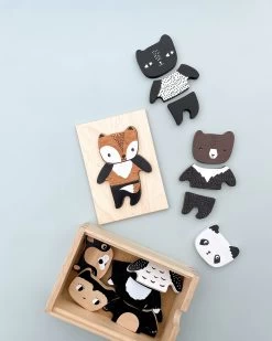 Mix + Match Animal Tiles are a classic toy reimagined in a unique style that is sure to inspire smiles. Six adorable animal characters can be combined any way for a seemingly unlimited creative play experience. The set contains 18 solid wood pieces with child-safe finishes and a natural wooden box for storage. Great for travel, or playtime at home, kids can develop motor skills and problem skills while designing their own combinations.