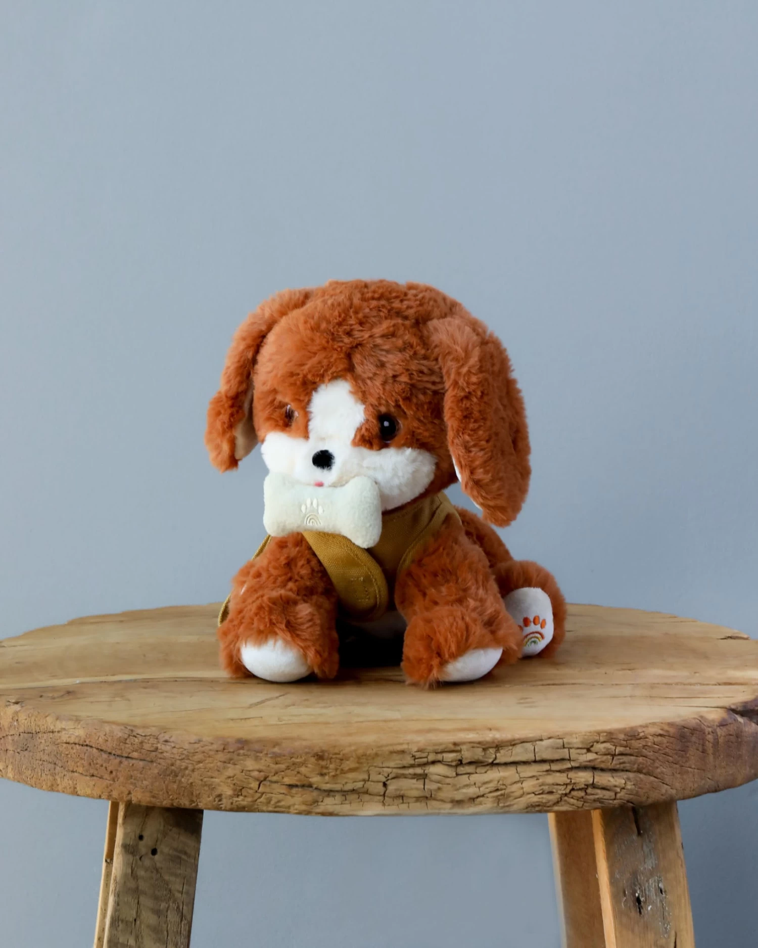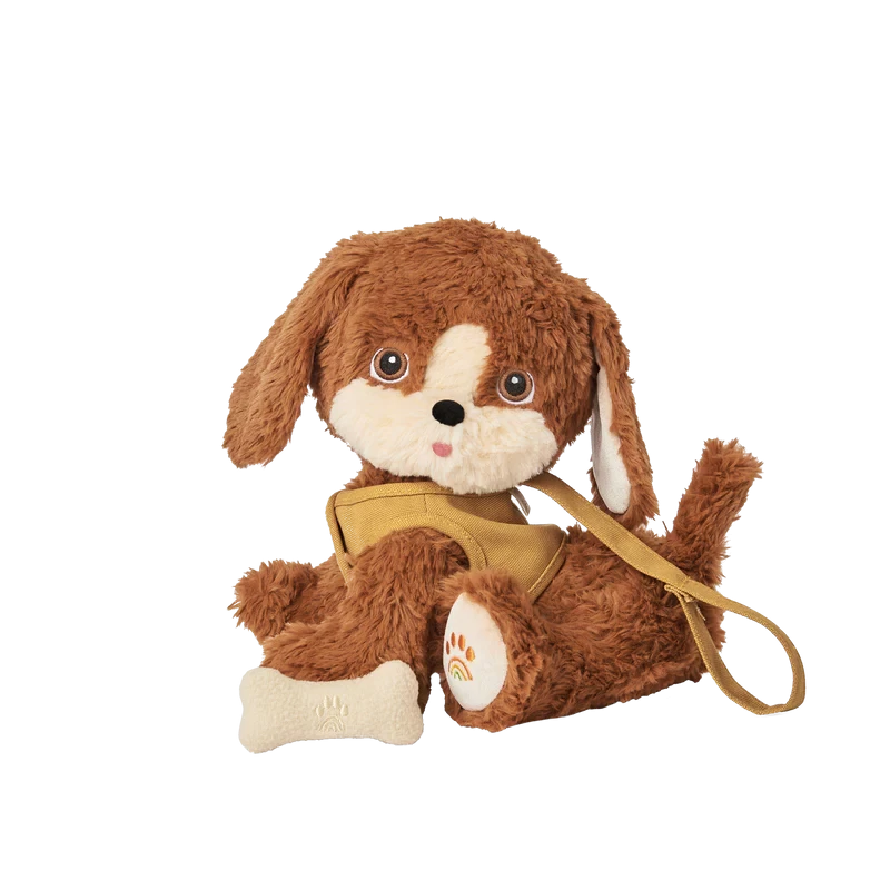 Made from soft plush fabric that is 100% recycled with velvety ears to nuzzle, Honey is fully poseable and can stand, lay down and even sit! Honey’s head moves and is embroidered with the sweetest doggy face, plus there’s a rainbow surprise on one of Honey’s little paws!Â