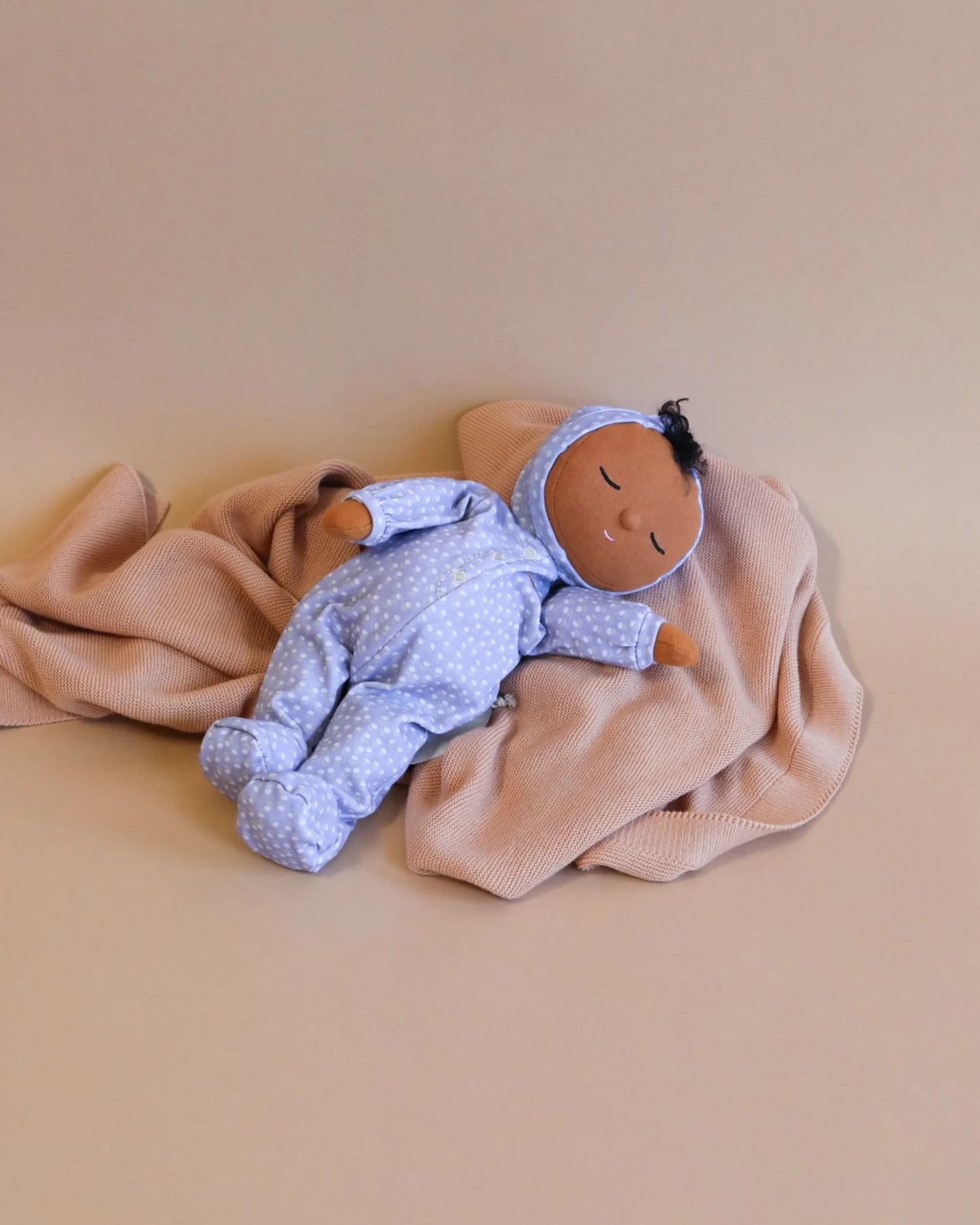 Dozy Bean is posable, made from super soft cotton, and features the sweetest embroidered face with a little tuft of hair. Each Daydream Dozy Dinkum wears a fixed suit with a rainbow right over their heart.