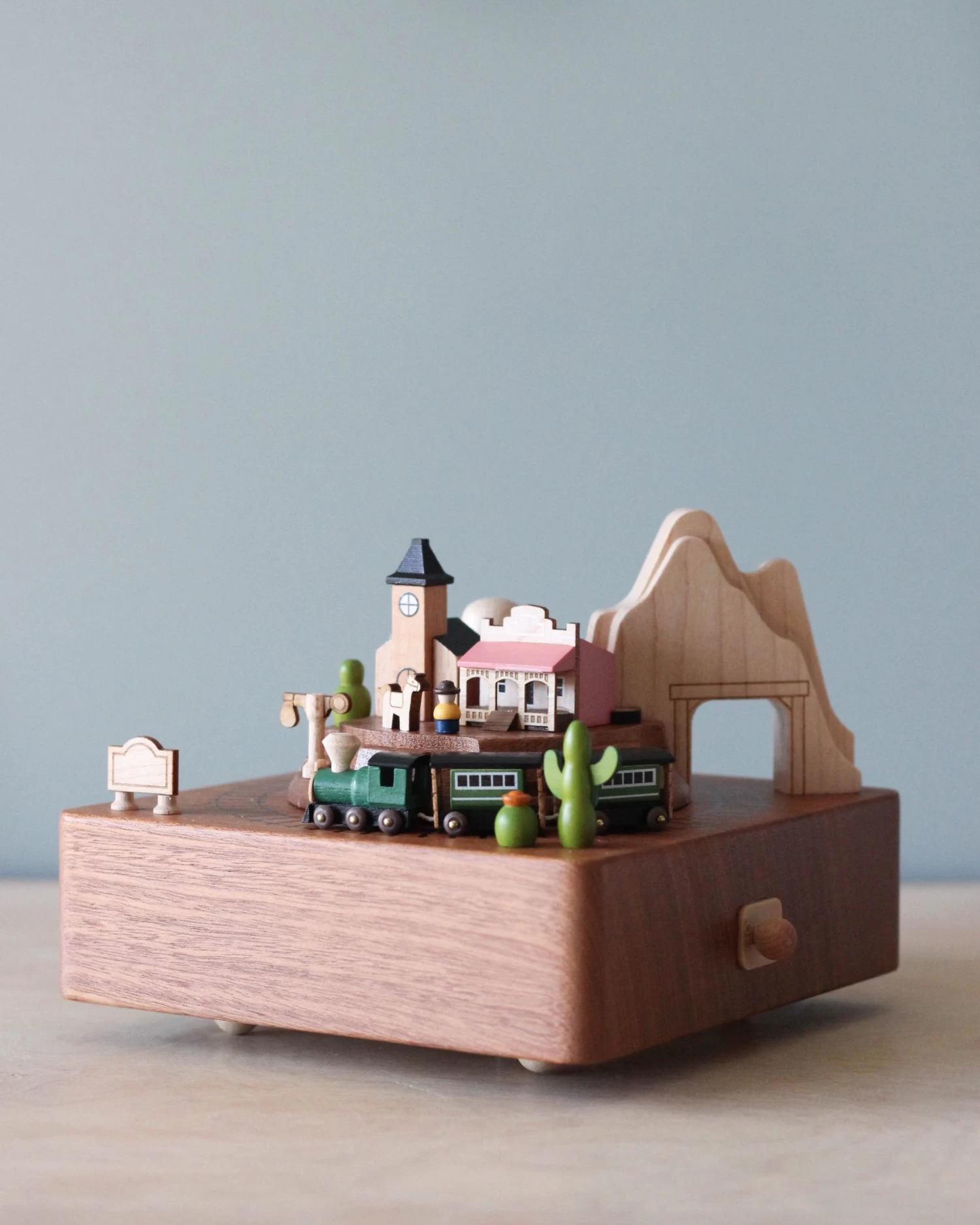 Combining nostalgia and a classic design, this hand cranked music box makes a great addition to any room or as a decoration on a shelf. The on/off toggle allows the music to start and turn off easily, while the clockwork mechanism enables the train to go around while the music is playing.