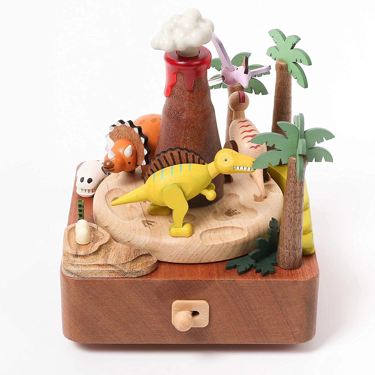 Combining nostalgia and a classic design, this hand cranked music box makes a great addition to any any room as a decoration on a shelf. The on/off toggle allows the music to start and turn off easily, while the clockwork mechanism enables the dinosaursĀ to go around while the music is playing.