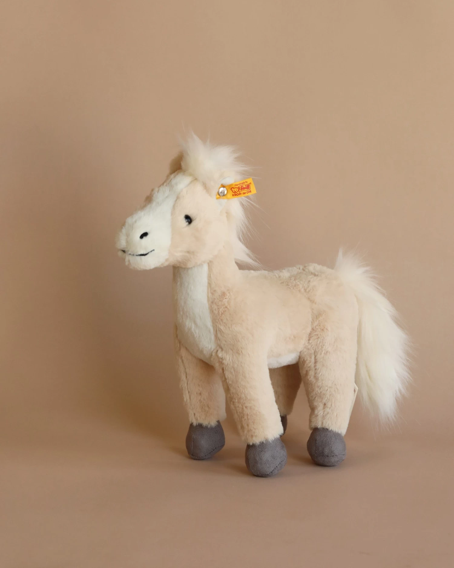This Soft Cuddly Friends Gola horse is absolutely adorably and incredibly irresistible! With her silky beige and white plush, fuzzy mane and tail, and her sweet face, Gola spreads happiness everywhere she roams. This lovable little horse invites you to snuggle up and dream with her – of flowering meadows and wild rides into the world of imagination! Itâs lovingly handmade from premium-grade materials by Steiffâs skilled artisans. Gola proudly wears the world famous âButton in Earâ trademark, symbol of highest quality. From the company that invented the Teddy bear in 1902.