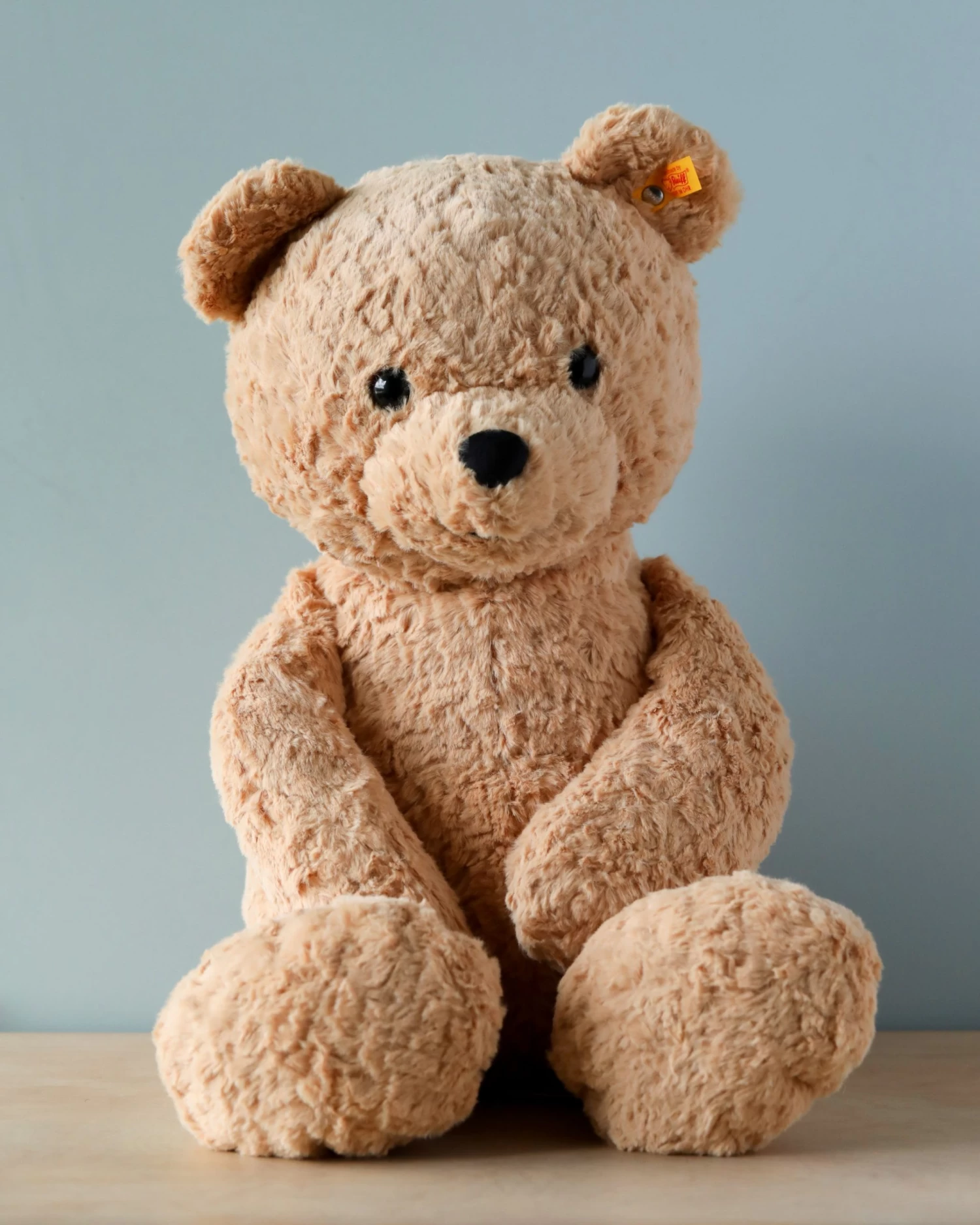 Product details: collection: plush teddy bears age group: safety tested for ages 0+ material: made of cuddly soft plush size: 22 inches color: light brown eyes: with safety eyes ear tag: with stainless steel “Button in ear” care: machine washable at 86a°f on gentle cycle.