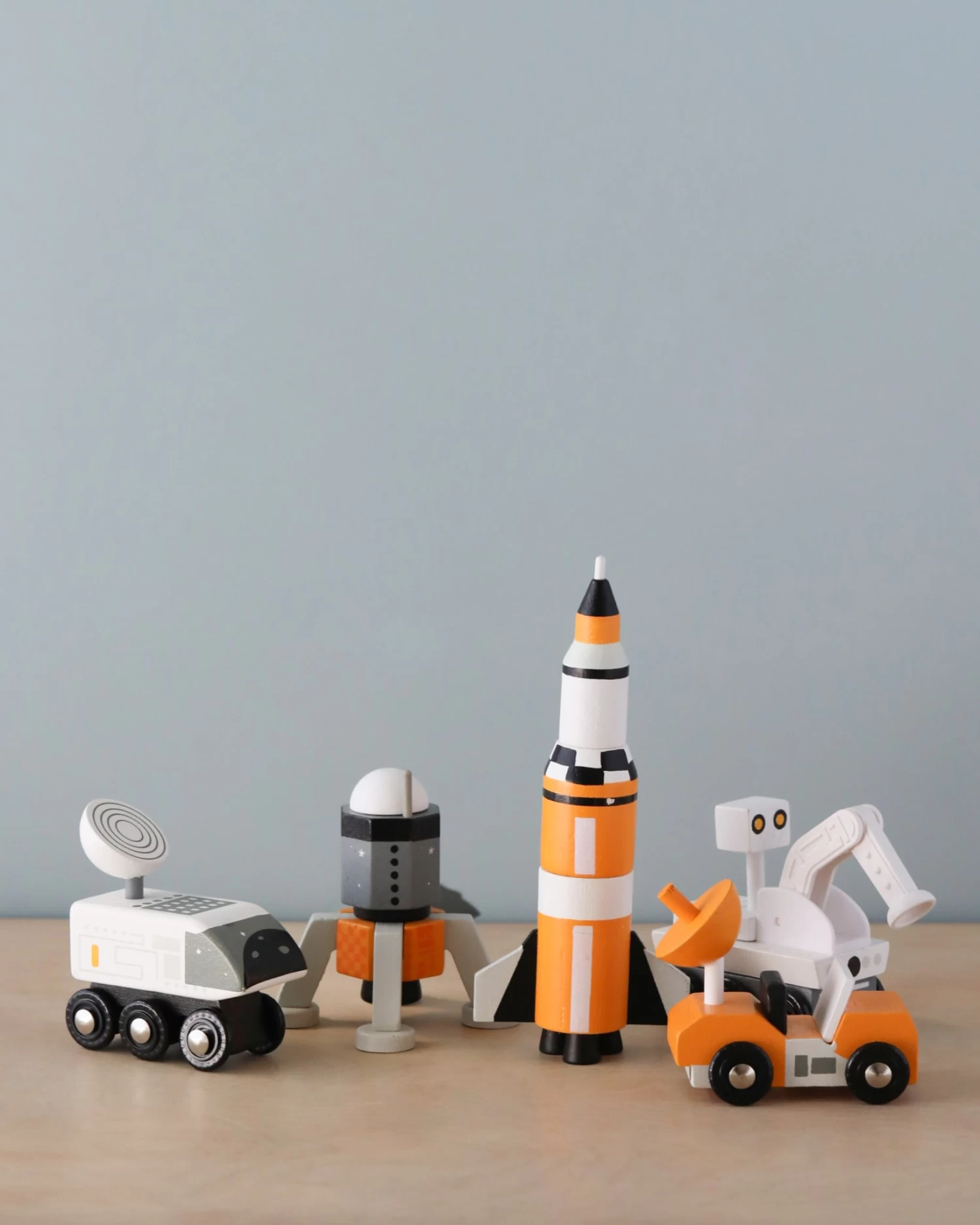 Solid wood space vehicles for inter-galactic adventures, set includes: a 3-part rocket, a moon landing capsule, a lunar roving vehicle, a launch crew rover, and a lunar probe.