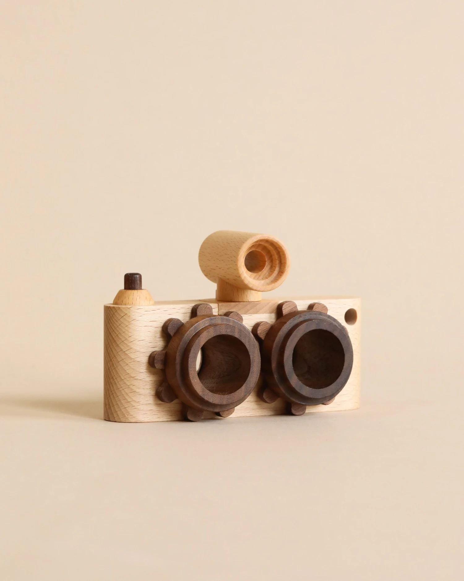 The Twinkle Wooden Toy Camera is made with high-quality walnut and beech solid wood. Inspired by the retro stereo camera, the Twinkle Wooden Toy Camera is able to stimulate our binocular vision and gives it the ability to mimic 3-D images when you look through the kaleidoscopic lenses. With a clickable shutter button and turning wheels on the viewfinders, children can find themselves having endless fun with this little “action-packed” wooden toy camera.