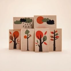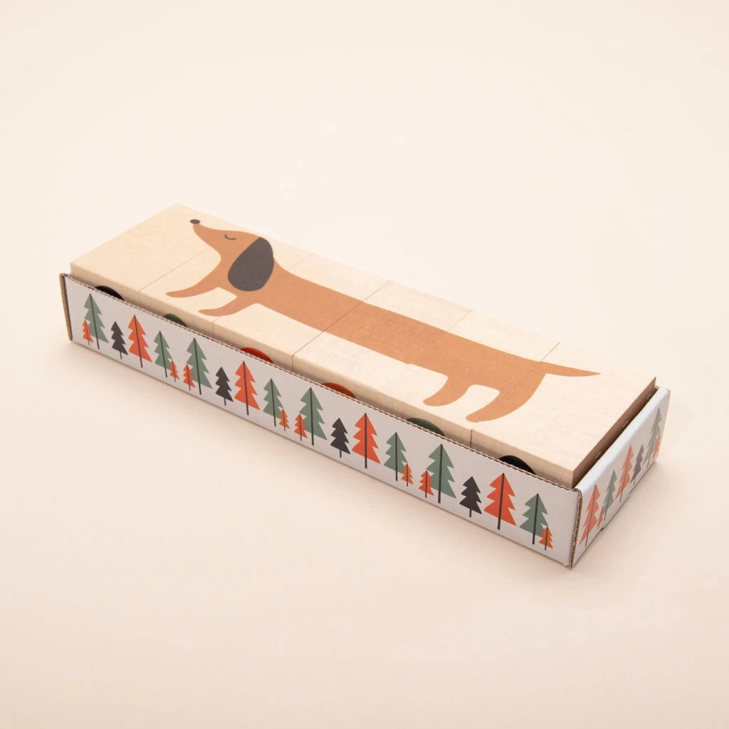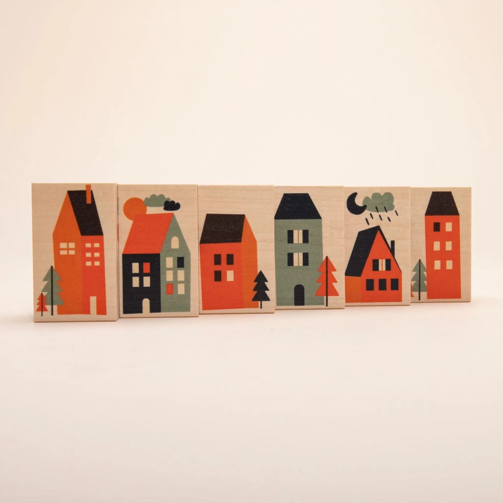 Explore the neighborhood environment. Count six houses. See how the weather changes with rains, clouds, sun, and moon. Put the dog puzzle together and measure eighteen inches with a ruler. This artful set is fun for play, and a pleasure to display.