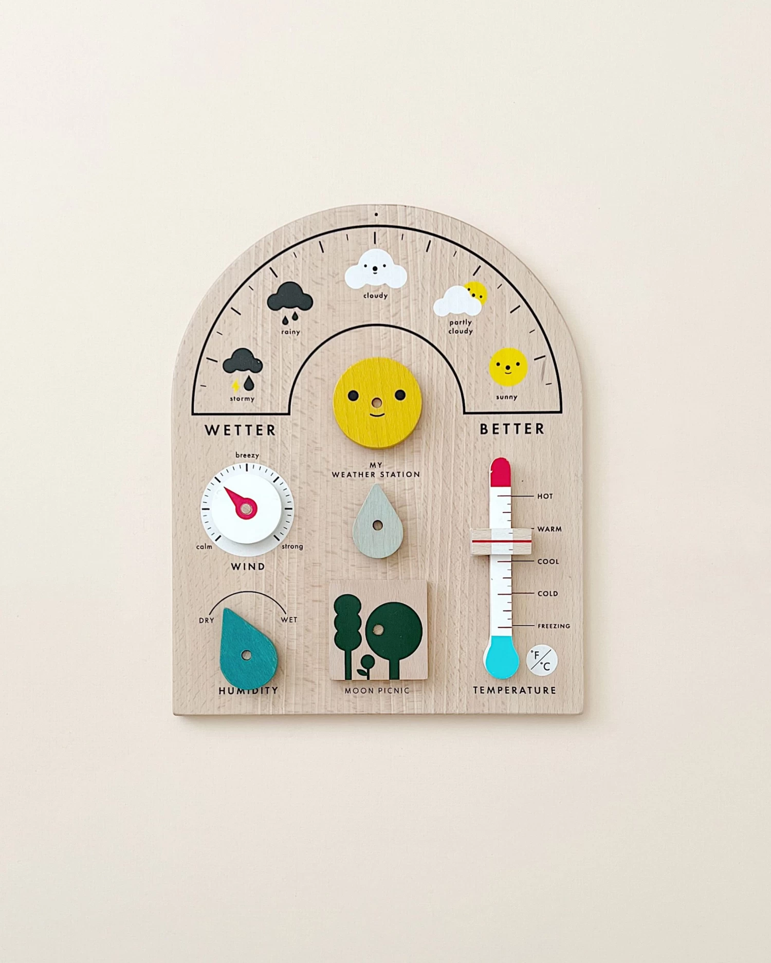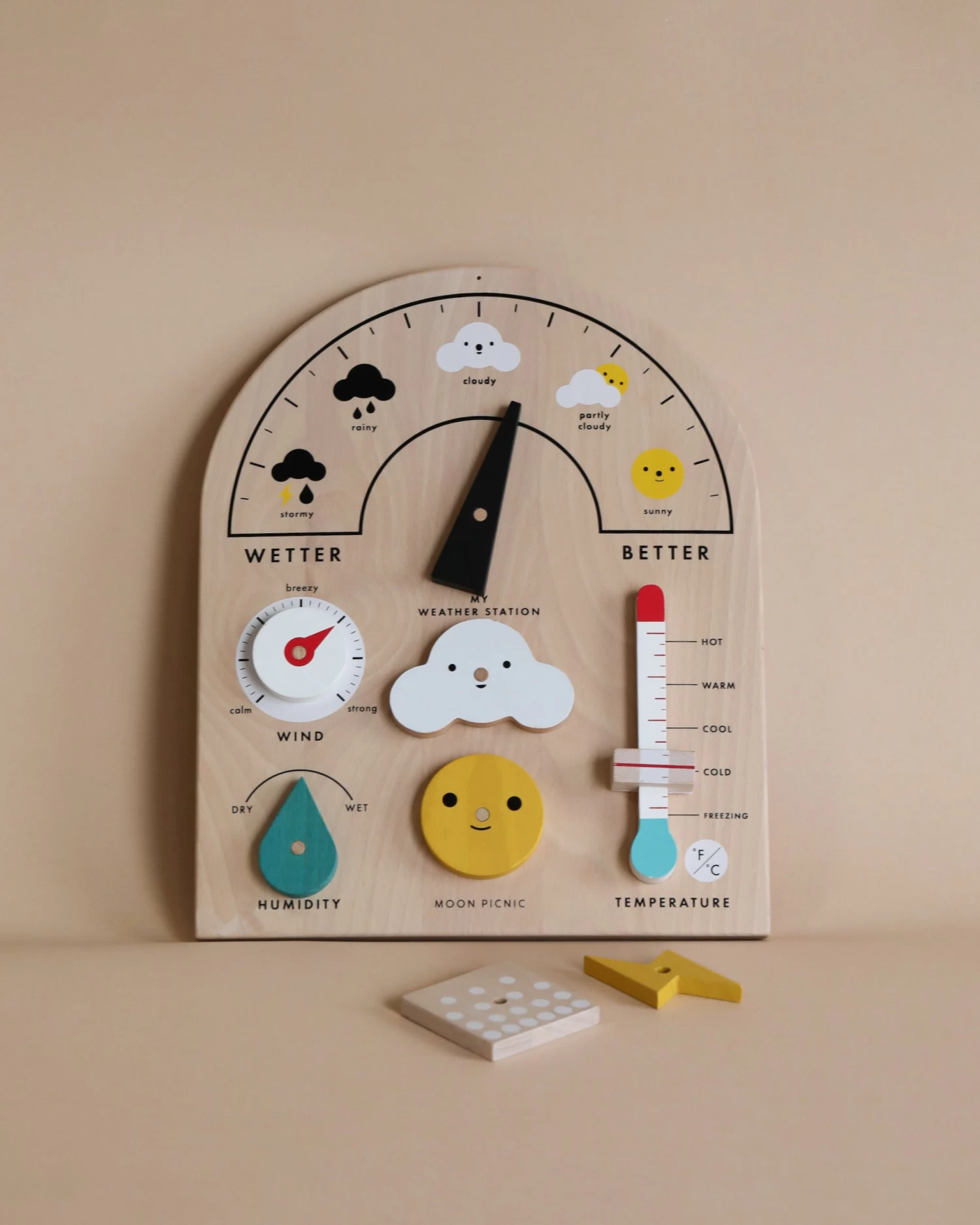 This fun & educational interactive toy has 4 movable parts and 5 weather symbols to display so little meteorologists can report and forecast the weather.