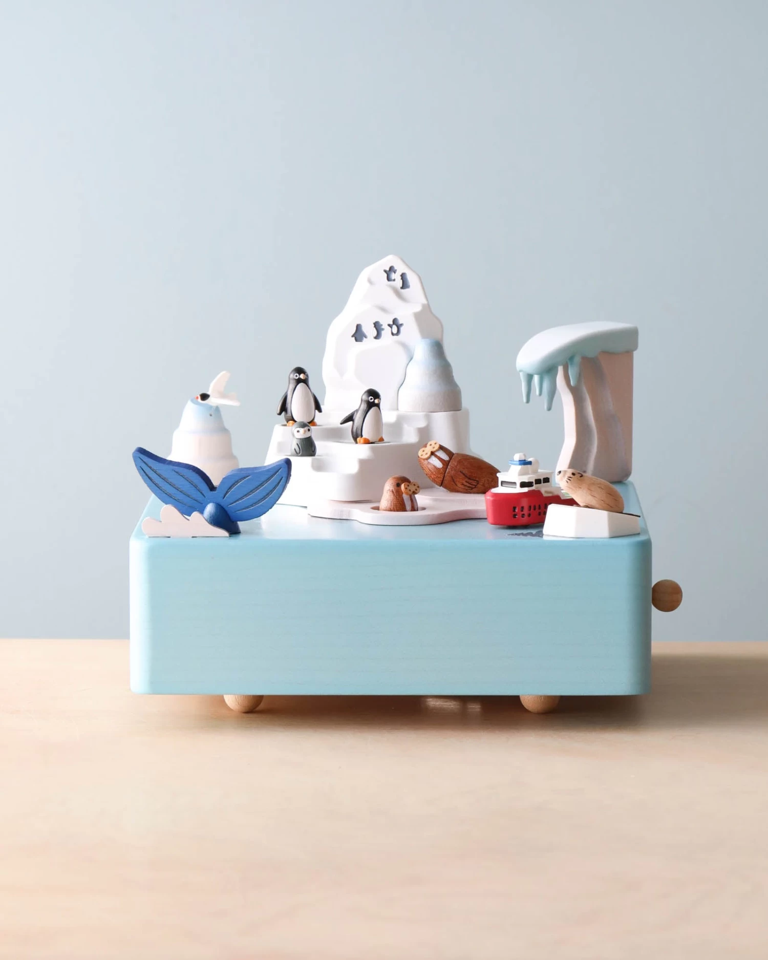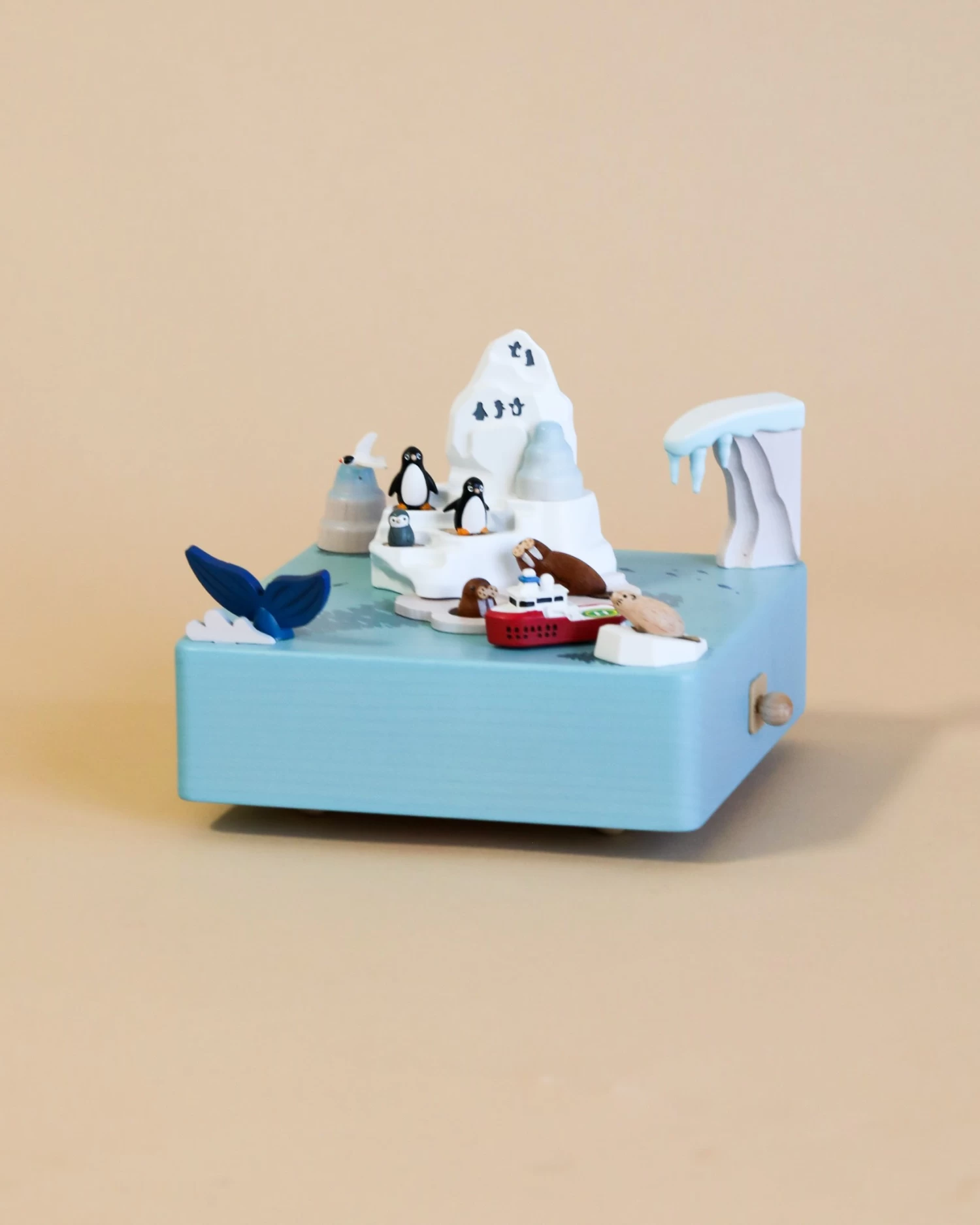 Combining nostalgia and a classic design, this hand cranked music box makes a great addition to any any room as a decoration on a shelf. The on/off toggle allows the music to start and turn off easily, while the winding mechanism and the magnet inside, rotate the boat around.Â